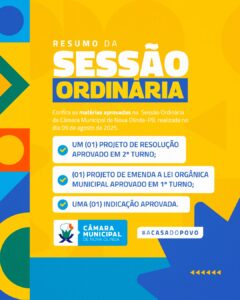 A Câmara Municipal de Nova Olinda realiza nesta quinta-feira, dia 09 de outubro, às 18h00,