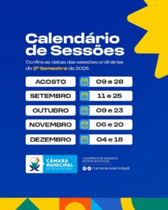 Câmara Municipal de Nova Olinda divulga novo calendário de sessões ordinárias https://camaranovaolinda.pb.gov.br/camara-municipal-de-nova-olinda-divulga-novo-calendario-de-sessoes-ordinarias/ https://camaranovaolinda.pb.gov.br/camara-municipal-de-nova-olinda-divulga-novo-calendario-de-sessoes-ordinarias/#respond Thu, 21 Aug 2025 22:26:42 +0000 https://camaranovaolinda.pb.gov.br/?p=3057 A Câmara Municipal de Nova Olinda divulgou o novo calendário de sessões ordinárias que passarão a ocorrer sempre às quintas-feiras, a partir das 18h. A mudança tem como objetivo adequar os trabalhos legislativos e ampliar a participação popular nas atividades da Casa.